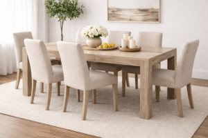 The Griffin 78″ Dining Table combines modern design with rustic charm. Crafted from solid mango wood, this table features a spacious rectangular top with a versatile, warm brown finish. The unique, A-frame base adds a touch of industrial flair while providing a sturdy foundation.